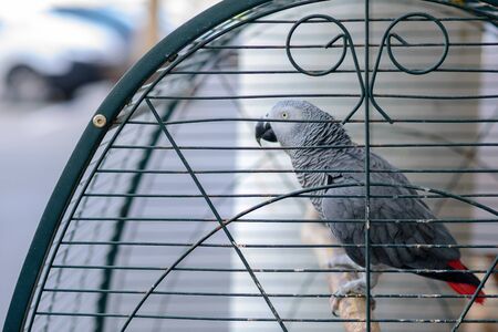 African Grey Parrot Jaco in cage. Pet store.