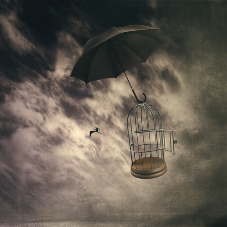 Conceptual Small Bird Flying Open Birdcage Surreal Motivation Liberty Graphic Art