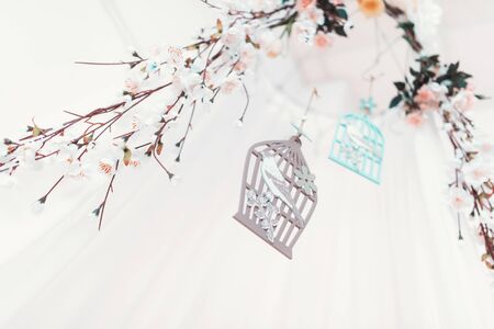 Wonderful branch with blossoming flowers with birds and bird cage