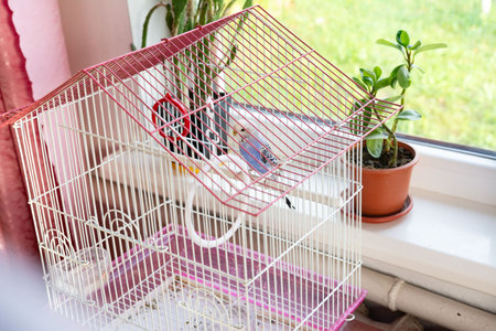 Bird cage with colorful parrot in peaceful setting
