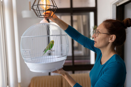 Woman hanging birdcage with a budgie near a lamp