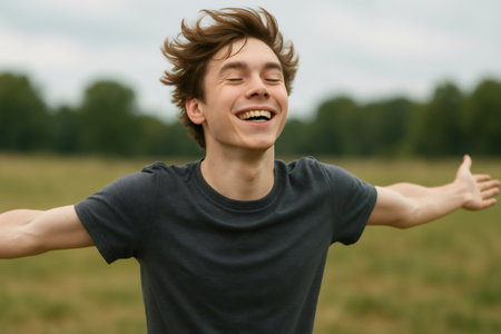 Carefree student spinning joyfully in a sunlit field, arms outstretched and eyes closed, embracing the freedom and happiness of summer