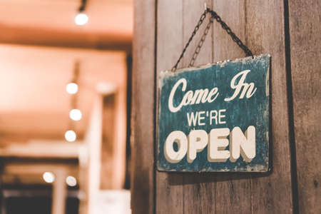 A business sign that says open on cafe or restaurant hang on door at entrance. Vintage color tone style.
