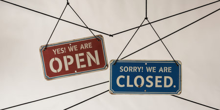 A striking image featuring two signs, one stating OPEN in red and the other CLOSED in blue, suspended from the ceiling of a shop. This visual captures the duality of business operations, reflecting the ebb and flow of customer service