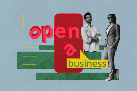 Exclusive creative collage of happy businessman businesswoman stand phone open business cloud development career progress