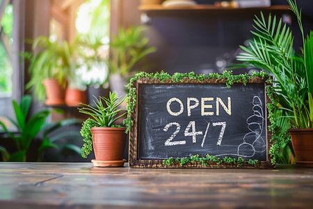 Hand-drawn OPEN 24/7 message on a chalkboard surrounded by cozy cafe decorations