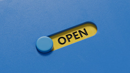 Open.slide switch spelling.Flat lay view from above on blue background with slide switch buttons.IT technology concept.3D rendering on blue background.