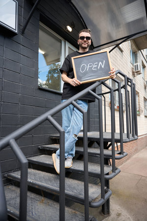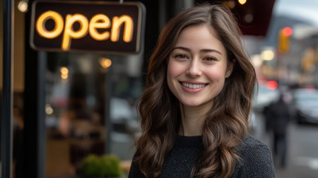 A happy small business owner standing in front of modern cafe with open sign, smiling confidently on city street in soft natural light