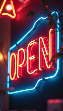 A striking neon sign illuminates the word OPEN in bold blue and red hues, creating a lively atmosphere. This eye-catching display invites customers in, radiating warmth and excitement, perfect for a bustling café or shop.