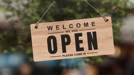 A hanging sign announces in bold letters, 'Welcome, We are Open' conveying invitation
