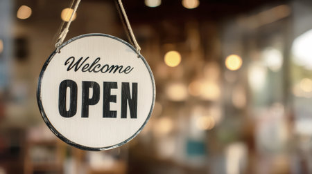 Close-up view of a white round signboard with the words Open and Welcome displayed prominently, hanging at the entrance of a cozy cafe, inviting customers inside.