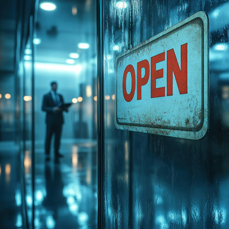 Bright 'open' sign shines in a modern atmosphere where a businessman stands quietly.