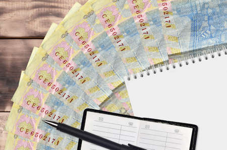 1 Ukrainian hryvnia bills fan and notepad with contact book and black pen. Concept of financial planning and business strategy. Accounting and investment