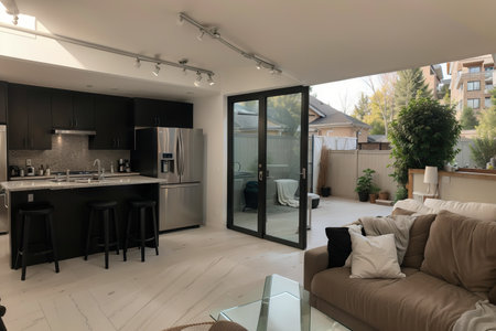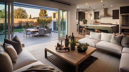 Spacious and modern open-concept living area with a gourmet kitchen, dining space, and comfortable seating. Generative AI