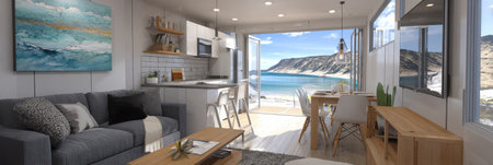 A living room filled with furniture next to the ocean. Generative AI image.