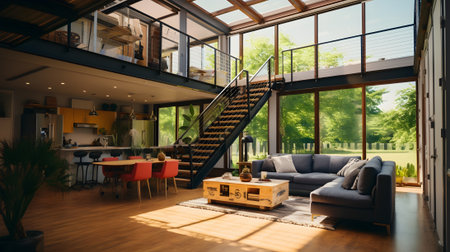 A bright and spacious modern living room features a skylight, a large sectional sofa, a cozy armchair, an industrial style kitchen with a large counter, and an open layout enhancing connectivity. AI generated image