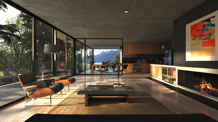 A stunning interior of a modern home overlooking a lake and mountains. Features include a fireplace, stylish furniture, large windows, and a kitchen. The lighting creates a warm, inviting atmosphere.