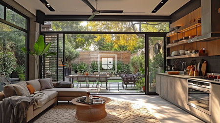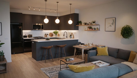 A spacious and bright living area seamlessly merges with a modern kitchen, featuring stylish furniture, warm tones, and ample natural light for a cozy yet elegant atmosphere.