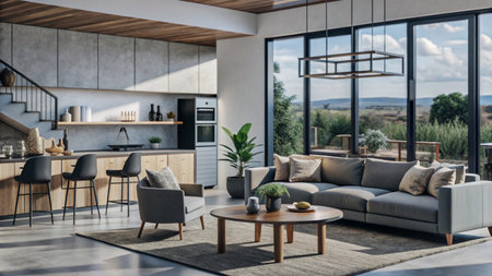 Modern living room interior design featuring elegant furniture and natural light in a spacious setting