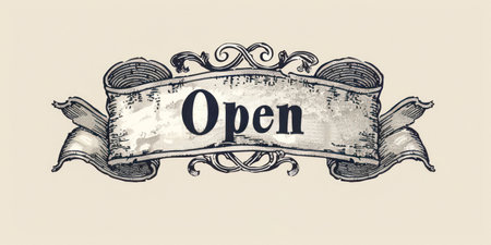 Text Open on old vintage ribbon banner and drawing in engraving style.