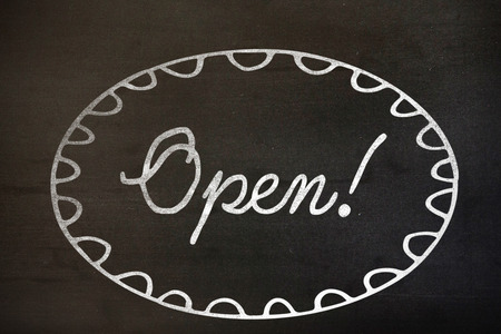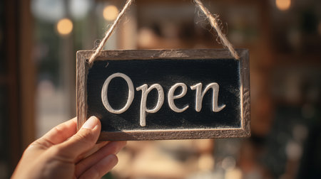 Hand turning an open chalkboard sign, welcoming customers to a small business