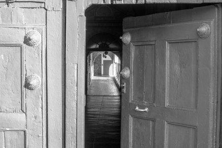 White wooden door open onto the atrium of a Peruvian palace in Peru in South America