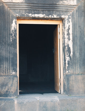 Old mystery wooden door to the underground vinery from the inside. Dark vintage inside walls and open doors isolated outside view.