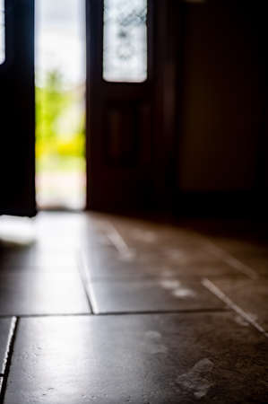 selective focus on Track of small child footprints visible on a tile floor with an open door letting in light in the background