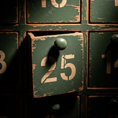 A wooden advent calendar with gold numbers sits on a white tabletop, reflecting the numbers. Soft, natural light illuminates the scene, creating a calm atmosphere.