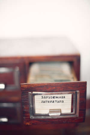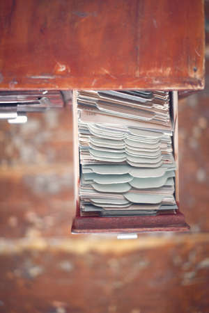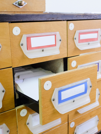 The Archives Card Catalog , old wooden file catalog box, index , database, archive and library concept.