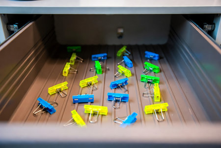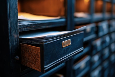 Elevate your workspace aesthetics with this captivating perspective of a well-organized filing cabinet showcasing neatly arranged documents waiting to be discovered.