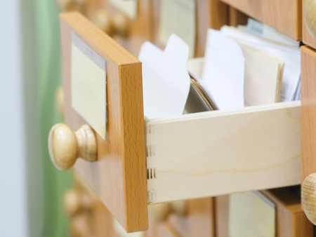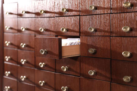 Library or archive reference card catalog. Database, knowledge base concept. Old library or archive reference catalogue with opened card drawer