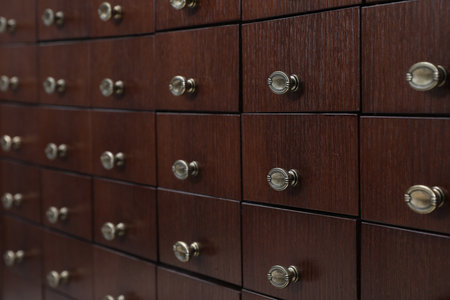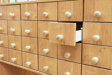 Old directory with many wooden index drawers. Vintage file catalog box. Concept for database, archive, library