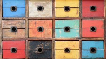 A charming arrangement of colorful vintage wooden drawers showcasing vibrant colors and rustic design. Perfect for home or decor projects.