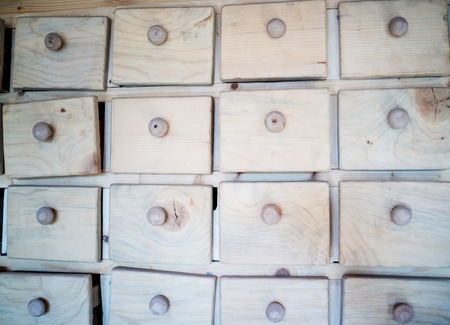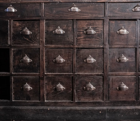 Closeup of vintage wooden furniture with small drawers - storage and sorting concept or just retro background.