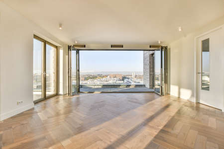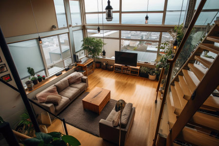 A spacious urban loft featuring large windows that offer a stunning view of the city skyline, complemented by indoor plants, creating a serene and stylish atmosphere.