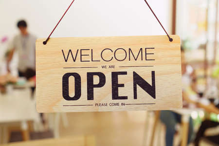 Open shop sign / Welcome open sign hanging on cafe glass door