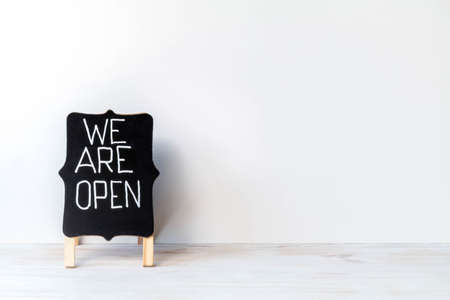 We are open - words written with white chalk on blackboard. Chalkboard with handwriting text WE ARE OPEN. Open sign. Copy space. Back to business concept