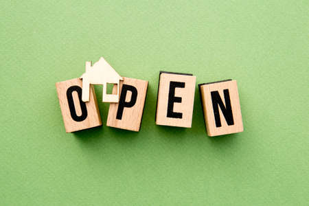 Reopen wording parting screen on wooden cubes block. Shopping mall and restaurants open again after COVID 19.