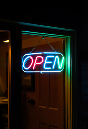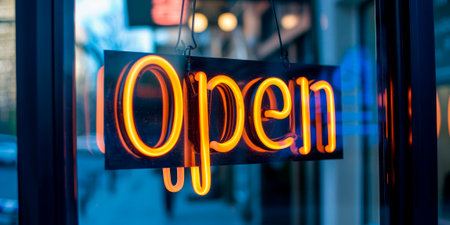 Neon orange sign with the word Open hanging on a glass door. High quality photo