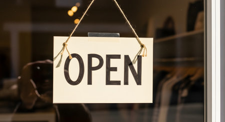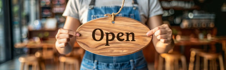 Close-up of a person wearing an apron holding an open sign at a store entrance. The background shows a blurred interior, symbolizing a welcoming business environment.