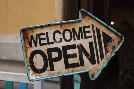 Welcome Open Sign. A business sign that says Come in We’re Open on cafe restaurant window