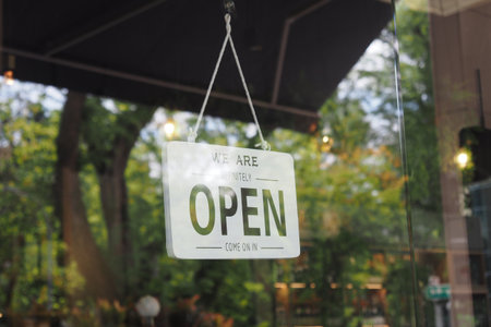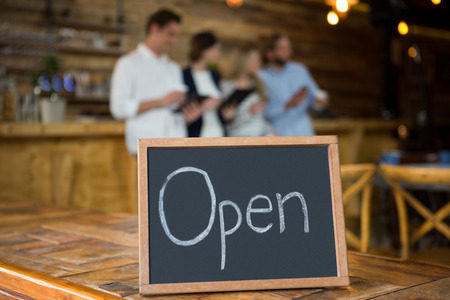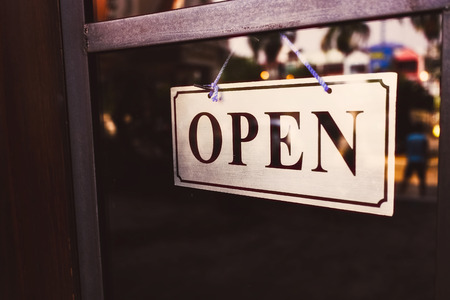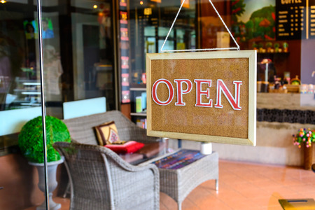Open sign board hanging on glass door of coffee shop or restaurant.
