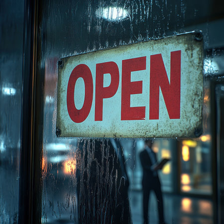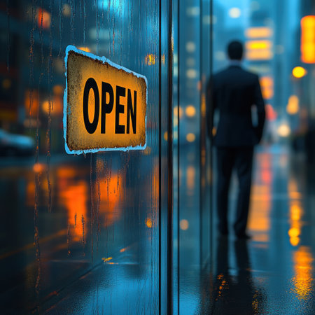 Rain soaked streets glow as a businessman stands near an open sign in a cityscape.