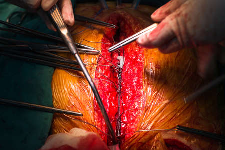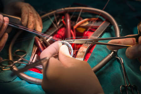 Surgeon hands are tying a knot during the open heart procedure chest during heart surgery