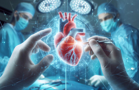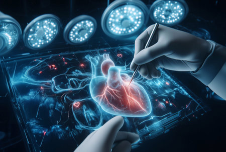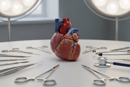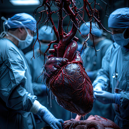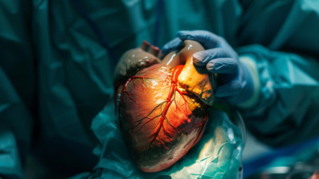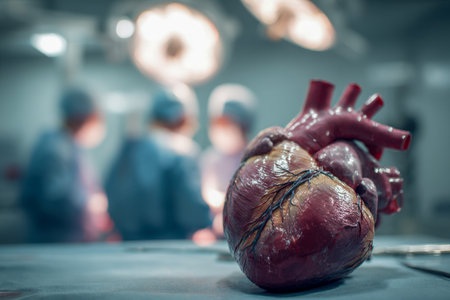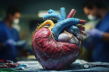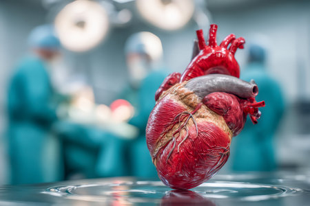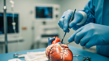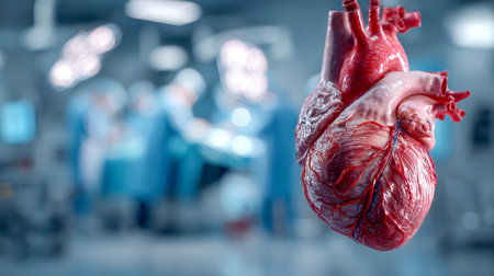 A life-like heart model occupies the foreground, set against a clinical surgical environment, with focused lighting highlighting its intricate chambers, while medica