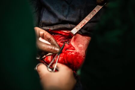 Closeup of professional doctor hands operating a patient during open heart surgery in surgical room. Healthcare and medical intervention concept