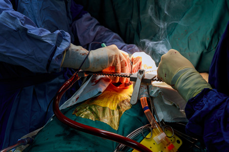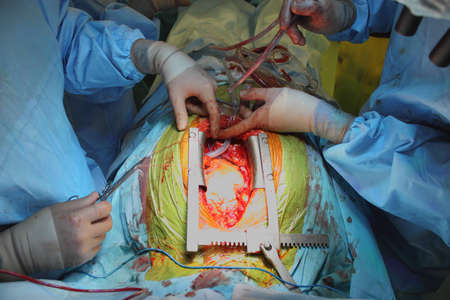 The surgeon the open-heart procedure chest during heart surgery on coronary artery bypass grafting