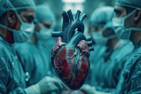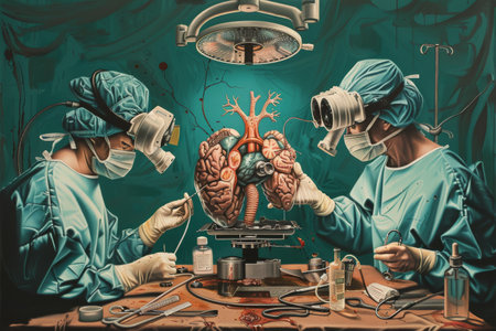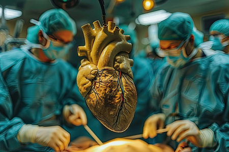 A detailed anatomical heart model dominates the front, while medical professionals work meticulously behind under intense, bright surgical illumination.