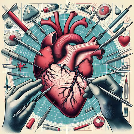 A realistic depiction of a surgical procedure reveals a prominently exposed human heart surrounded by intricate veins and arteries, set against a clinical hospital b